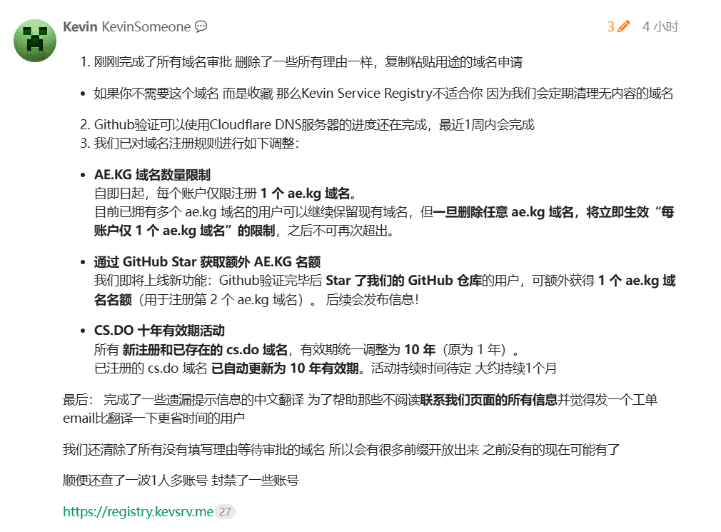 目前已拥有多个 ae.kg 域名的用户可以继续保留现有域名,但一旦删除任意 ae.kg 域名,将立即生效“每账户仅 1 个 ae.kg 域名”的限制,之后不可再次超出。通过 GitHub Star 获取额外 AE.KG 名额